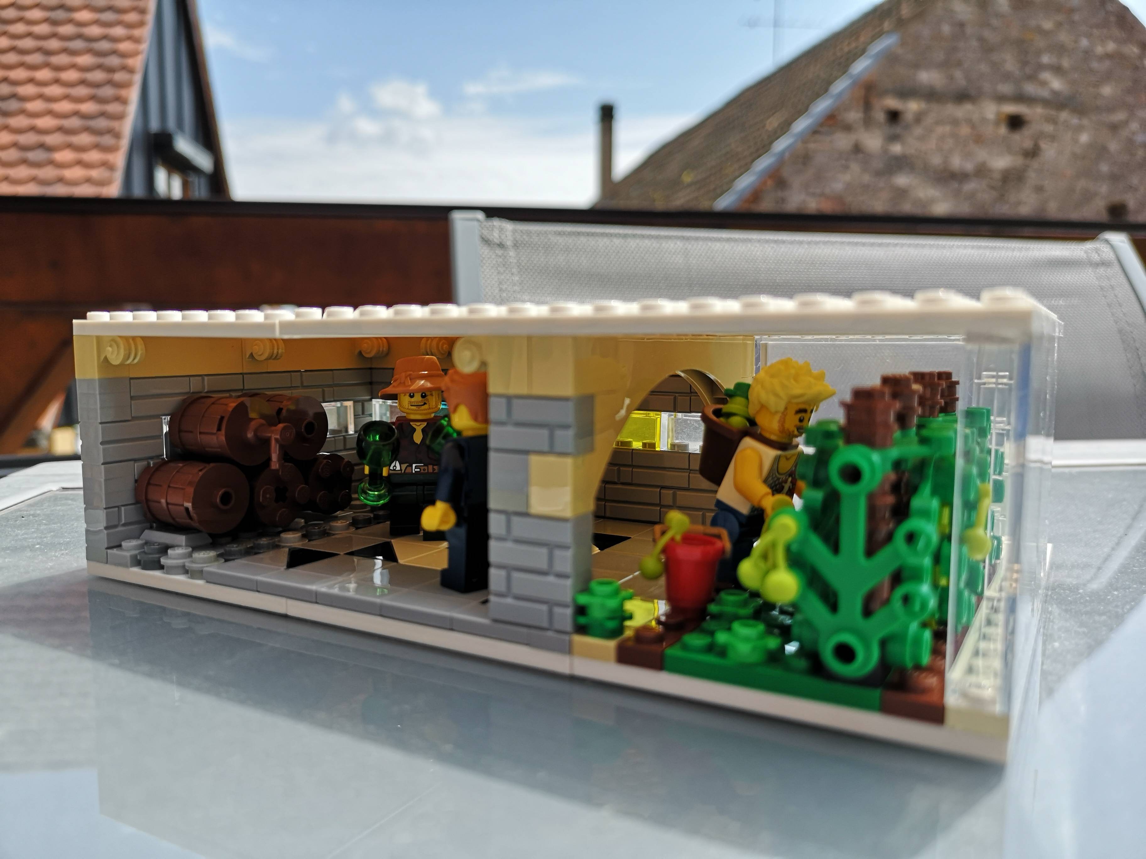 Petit caveau traditionnel de dégustation avec le viticulteur et un client, quelques barriques et bouteilles. A droite un rang de vigne pendant les vendanges.