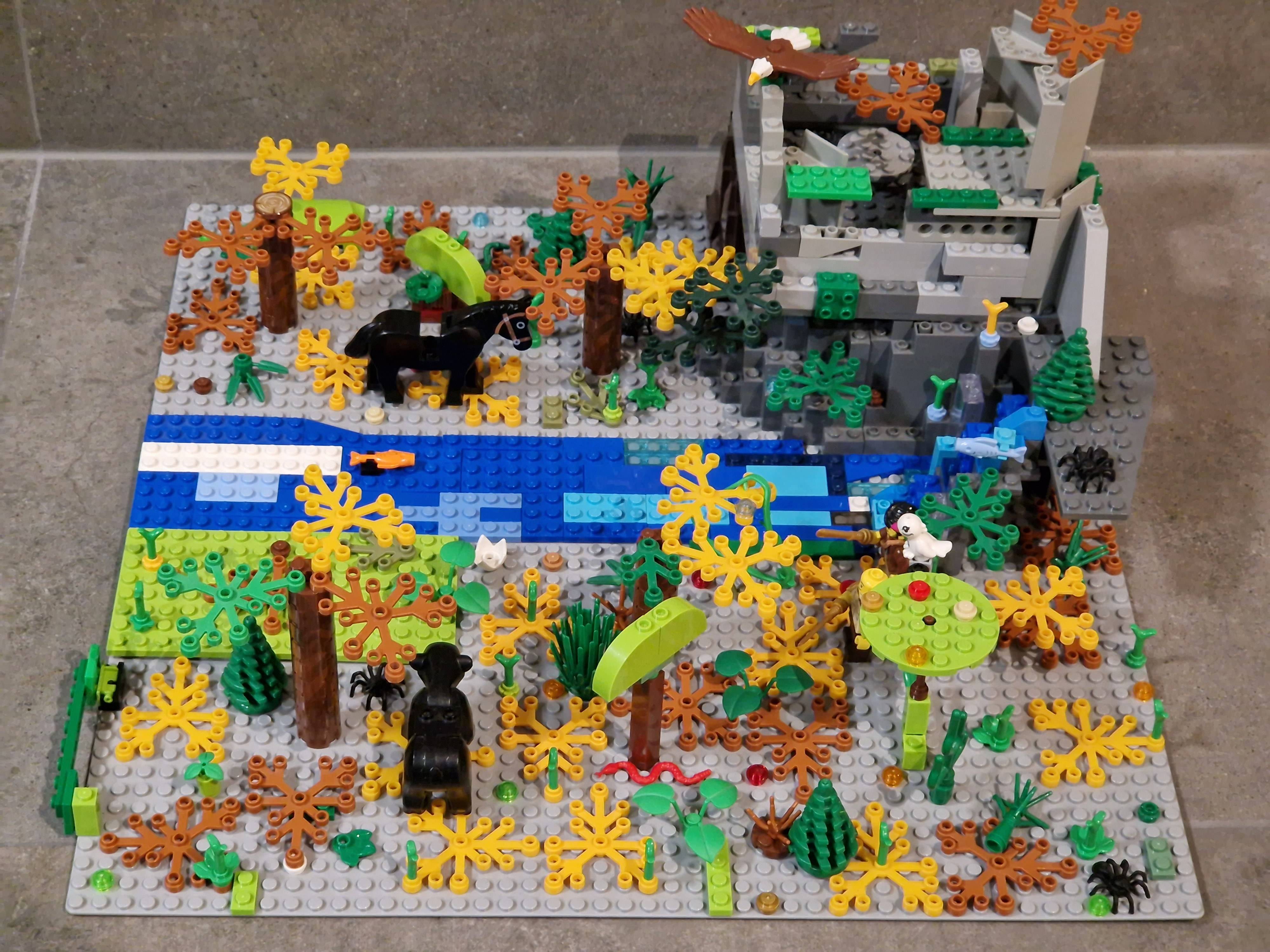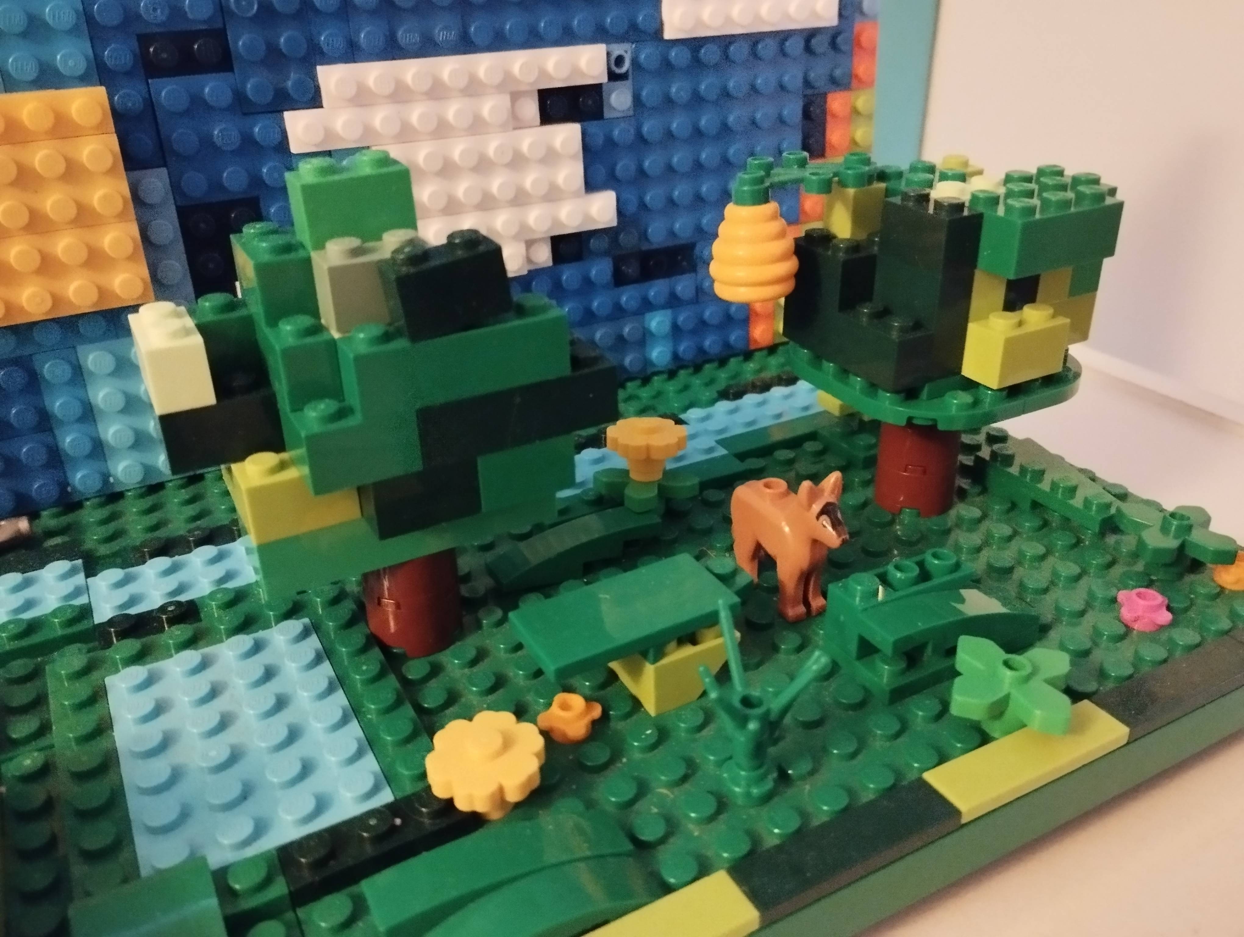 Une forêt, des animaux, le bruit d'une rivière qui coule derrière. Un ciel nuageux avec un beau soleil et un petit Arc en ciel à droite.