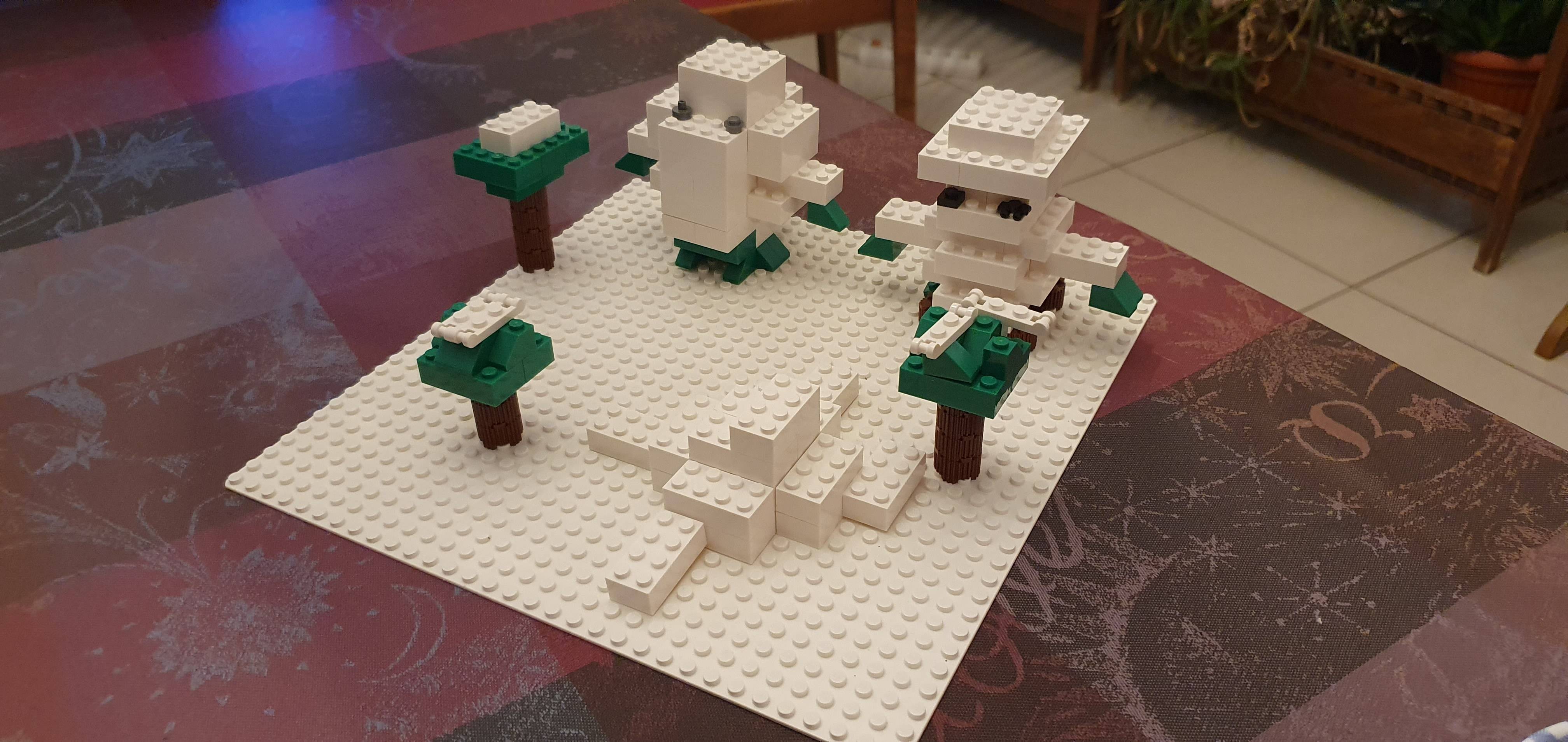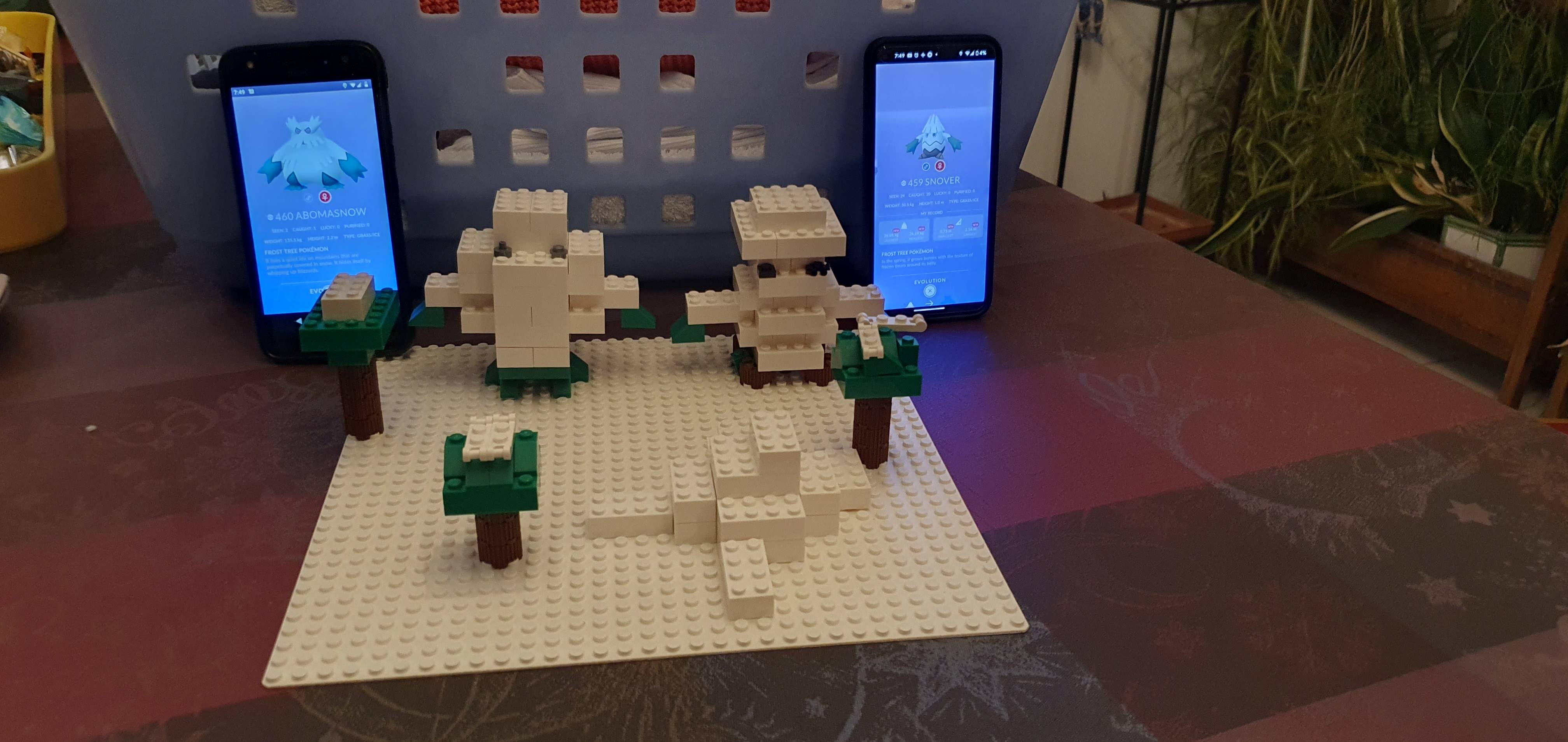 Blizzi et son évolution bizzaroi sont deux pokémons de type plante et glace. Ils sont ici représentés dans leur habitat naturel à savoir une forêt enneigée.
